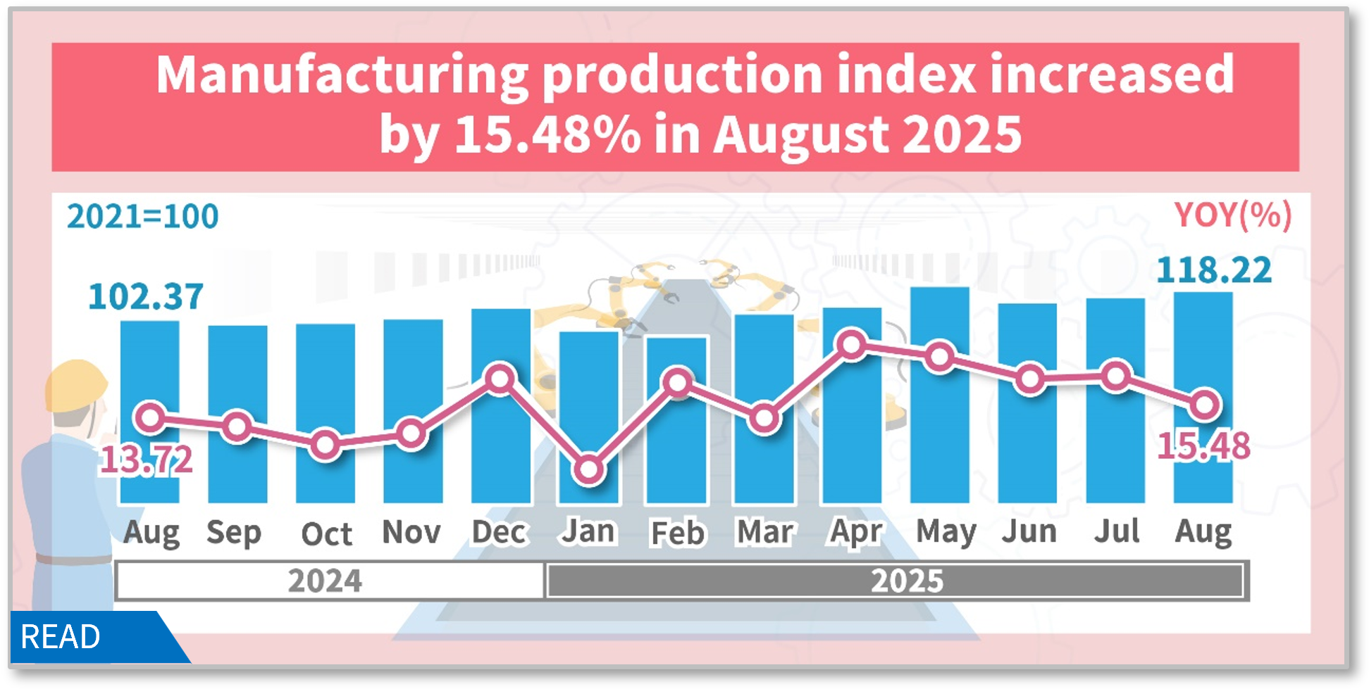 The industrial production index increased by 14.41% in August 2025 compared with the same month in 2024, which included the manufacturing sector increased by 15.48%, mining and quarrying decreased by 12.81%, electricity and gas supply decreased by4.46%, and water supply decreased by 2.29%.