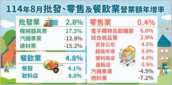 2. 零售業:8月零售業營業額為3,915億元,年增0.4%,其中因業者掌握節慶採買及暑假出遊商機,積極展開促銷活動攬客,並強化販售商品多樣性,加以持續布點擴展營運規模,致電子購物及郵購業年增6.0%、百貨公司年增4.5%、便利商店年增4.0%、藥品及化粧品零售業年增2.0%;惟經濟前景不確定性尚存,加以出國人潮續增,減緩國內汽車及精品等耐久財消費動能,致汽機車零售業年減4.5%(因民俗月落點差異,比較基期偏低,年減幅度相對縮小),布疋及服飾品零售業年減2.9%;燃料零售業亦因油價低於上年同月,年減7.2%。綜計1至8月營業額為3兆1,454億元,年減0.7%。