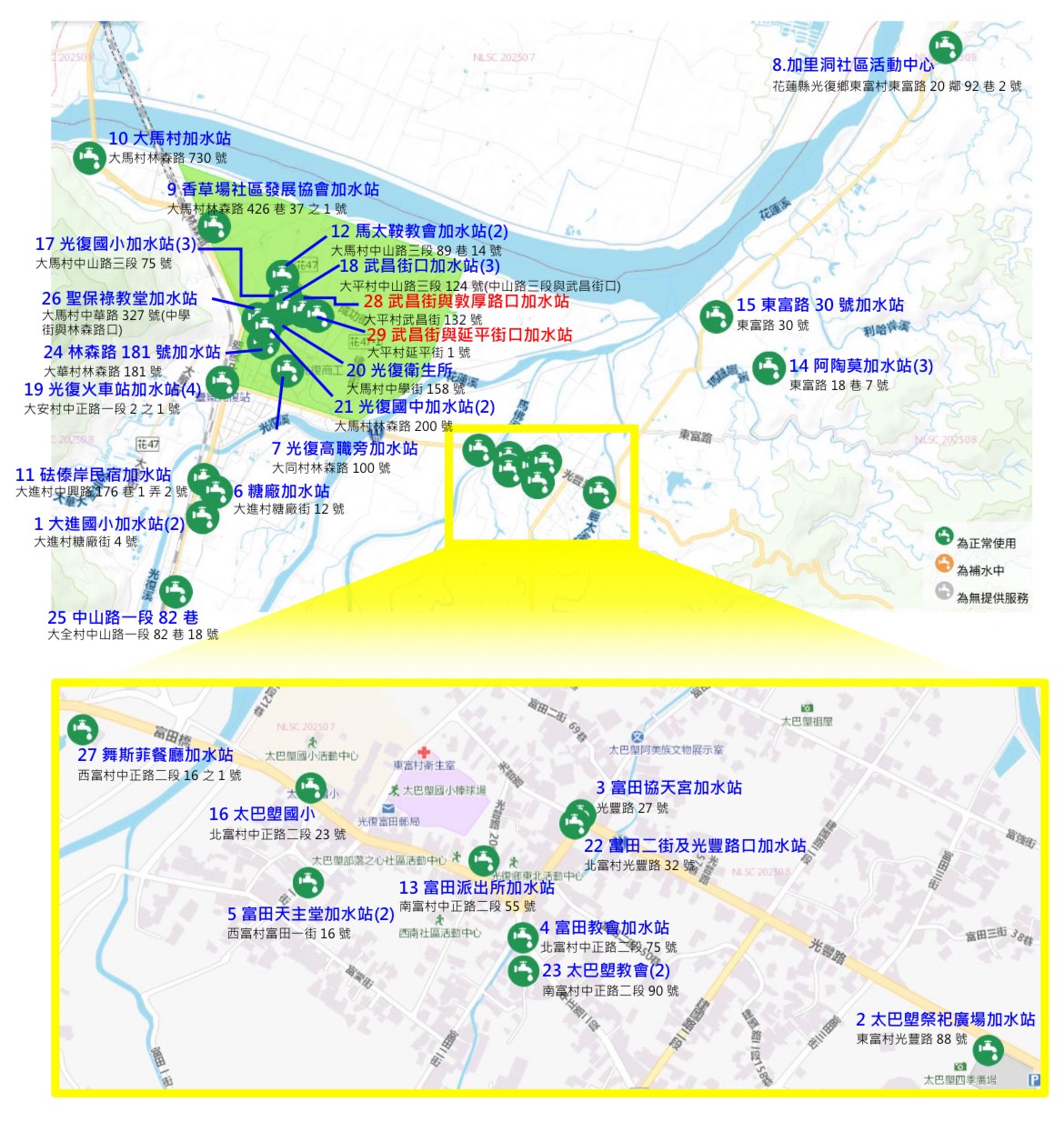 花蓮馬太鞍溪堰塞湖溢流事件,造成光復鄉嚴重災損,導致該鄉大範圍停水。在台水公司連日全力搶修下,大部分區域已逐漸恢復供水,惟大平村、大馬村等區域仍存在無水及低水壓之情況。