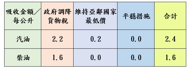 按浮動油價機制調整原則,汽油每公升應調漲0.2元、柴油應調降0.2元,惟為維持價格低於亞洲鄰近國家(日、韓、港、星),汽油吸收0.2元。吸收金額如附表。
