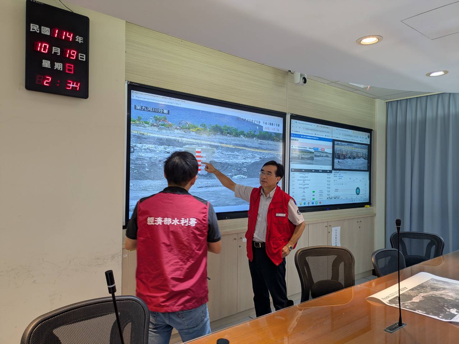 另外,為確保施工機具、人員安全,昨(18)日已配合前進協調所順利完成疏散撤離演練,未來當河川水位達一、二級警戒時,九河分署將發布通報單至花蓮縣政府及警戒區域相關機關單位,確保皆有接收並回傳完成,另將發送撤離簡訊予河道施工廠商及人員,重型機具撤離至堤頂及安全處,河道內人員立即清空。