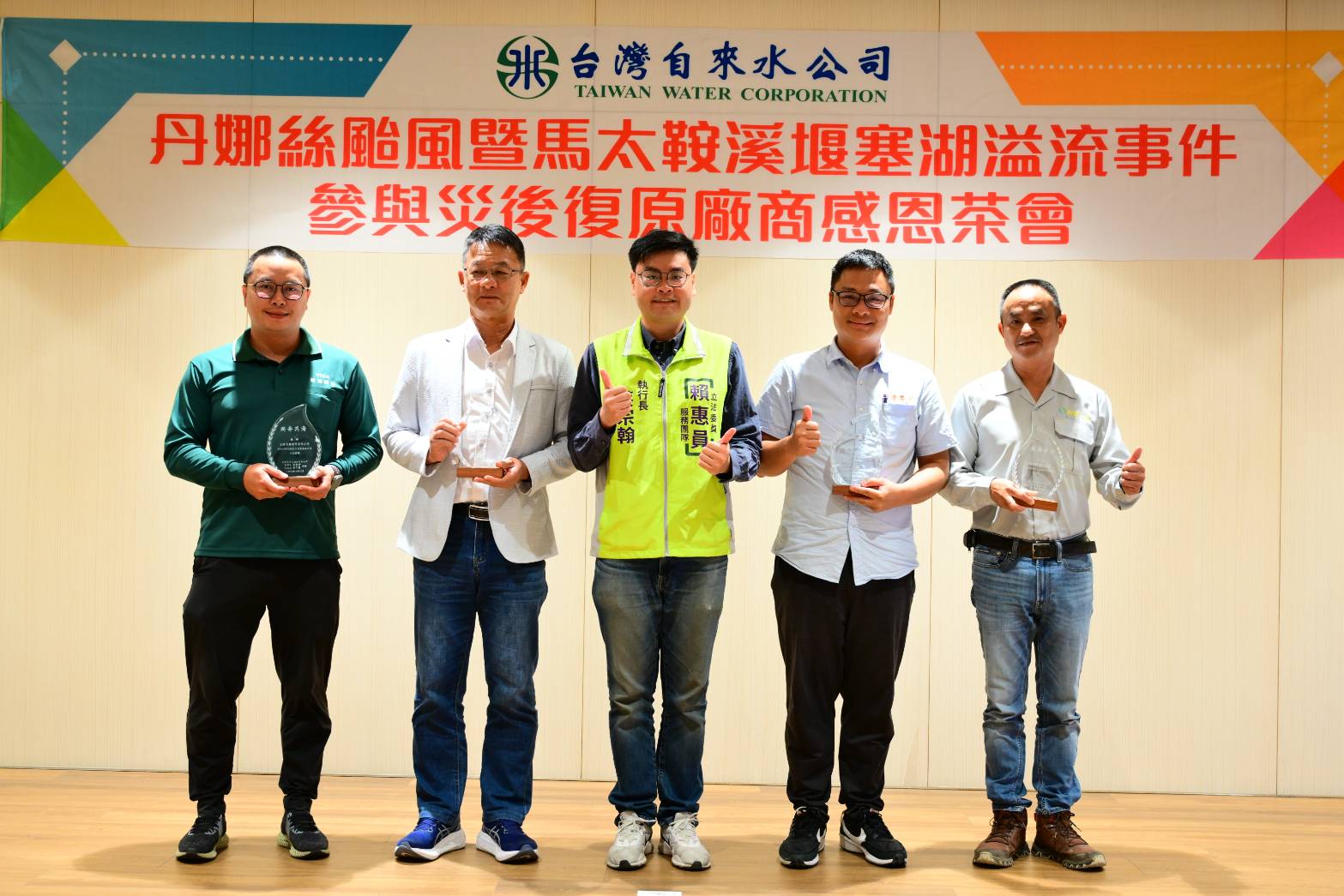 台灣自來水公司今(23)日舉行災後復原協力廠商表揚典禮,公開表揚在丹娜絲颱風台南風災屋頂修繕協力廠商及花蓮縣馬太鞍溪堰塞湖溢流事件協助復水廠商,積極投入災後復原作業,肯定其貢獻與專業投入。