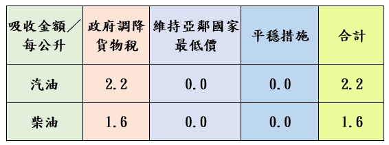 維持亞鄰最低價及調降貨物稅 汽、柴油各吸收2.4元及1.6元 明(6)日起汽油價格不調整、柴油調降0.2元