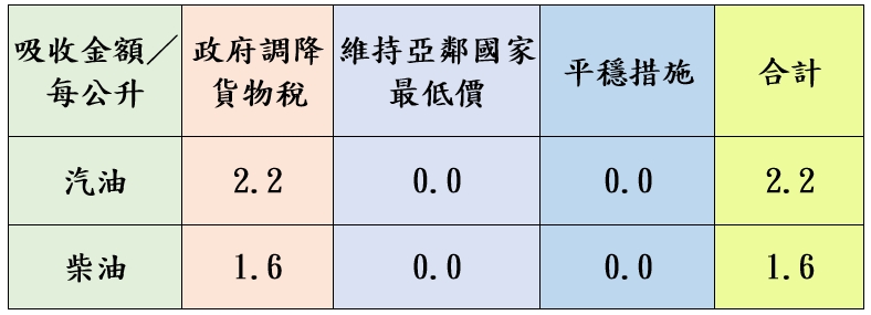 本週依油價公式及政府調降貨物稅(汽、柴油每公升各共2元及1.5元)調整國內油價,並持續以亞鄰國家最低價及平穩措施運作,協助穩定國內油價,114年累計至11月底止,台灣中油共吸收約64.44億元。調價後各式油品參考零售價格調幅及調整金額如附表,實際零售價格以各營業點公告為準。(亞鄰油價資訊請參考全球資訊網https://www.cpc.com.tw產品與服務--產品價格與資訊--亞鄰各國比較表)