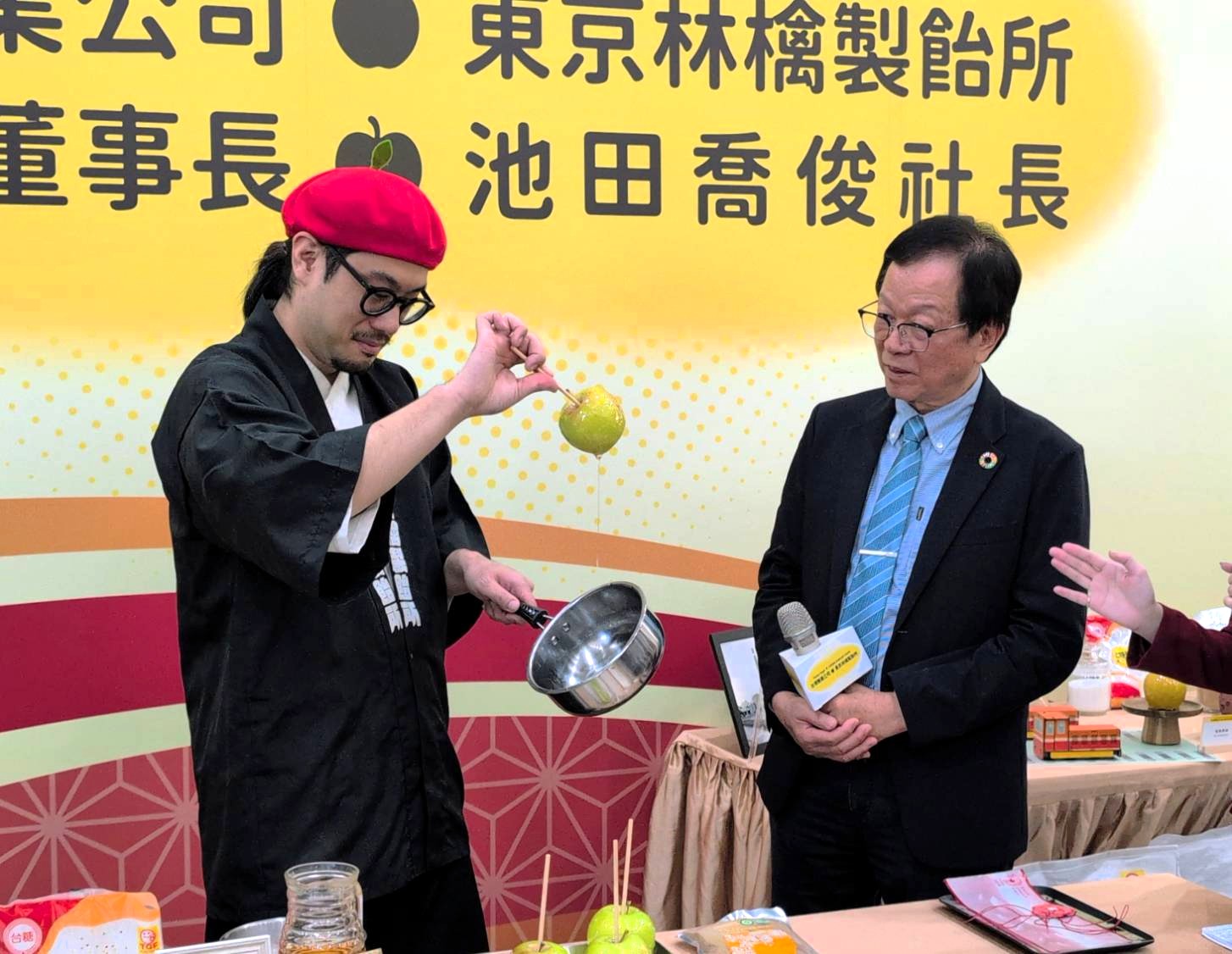 日前因來臺狂掃台糖精緻細砂引起海關查驗而爆紅的東京林檎製飴所社長池田喬俊,今(9)日造訪台糖與董事長吳明昌相談甚歡,並現場製作具有專利的蘋果糖工藝,吳董事長與台糖人員品嚐「台糖NO.1蘋果糖」後均讚不絕口,雙方也將更進一步討論未來的合作模式,讓一場意外牽引出甜蜜的交流與日後臺日的商機。