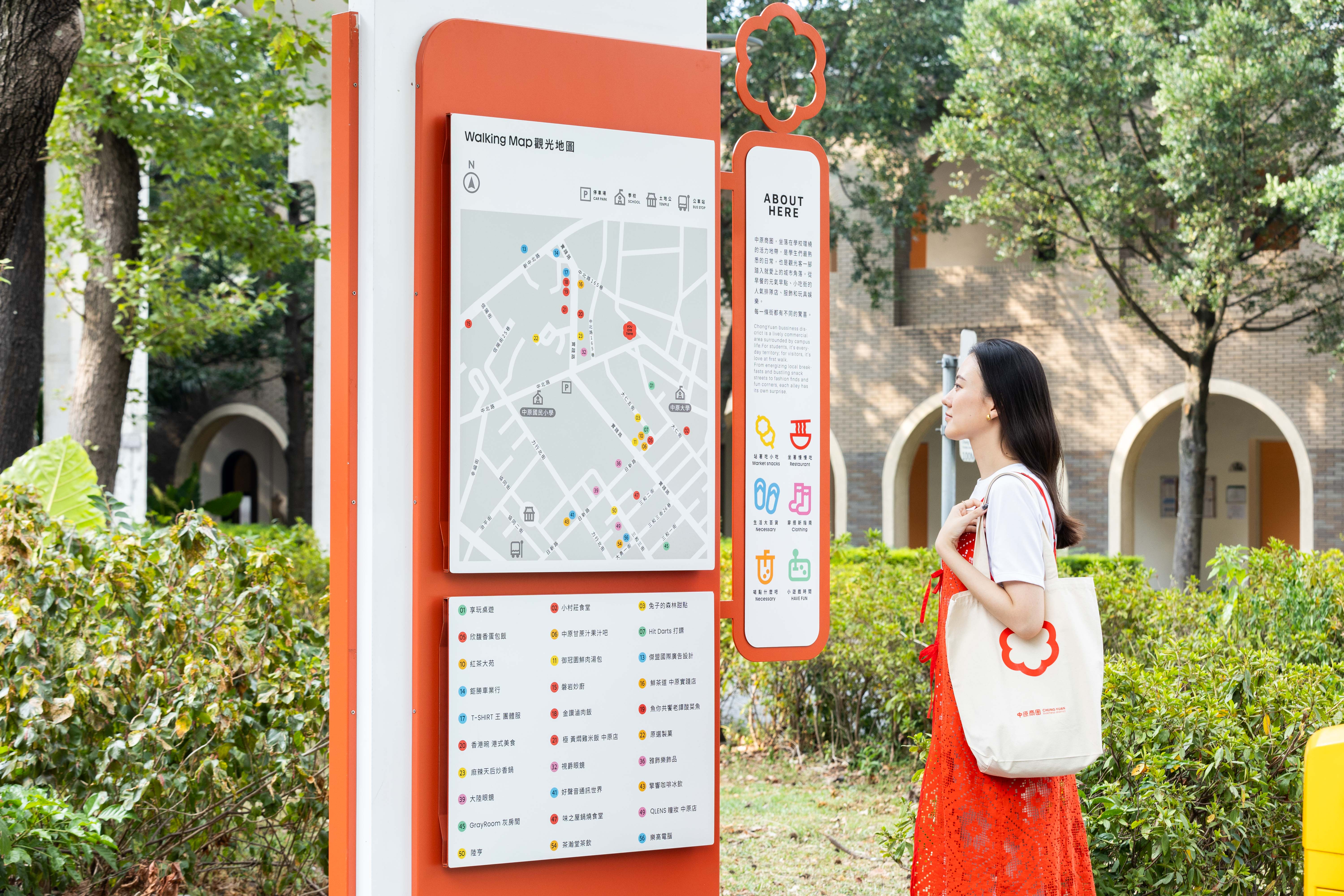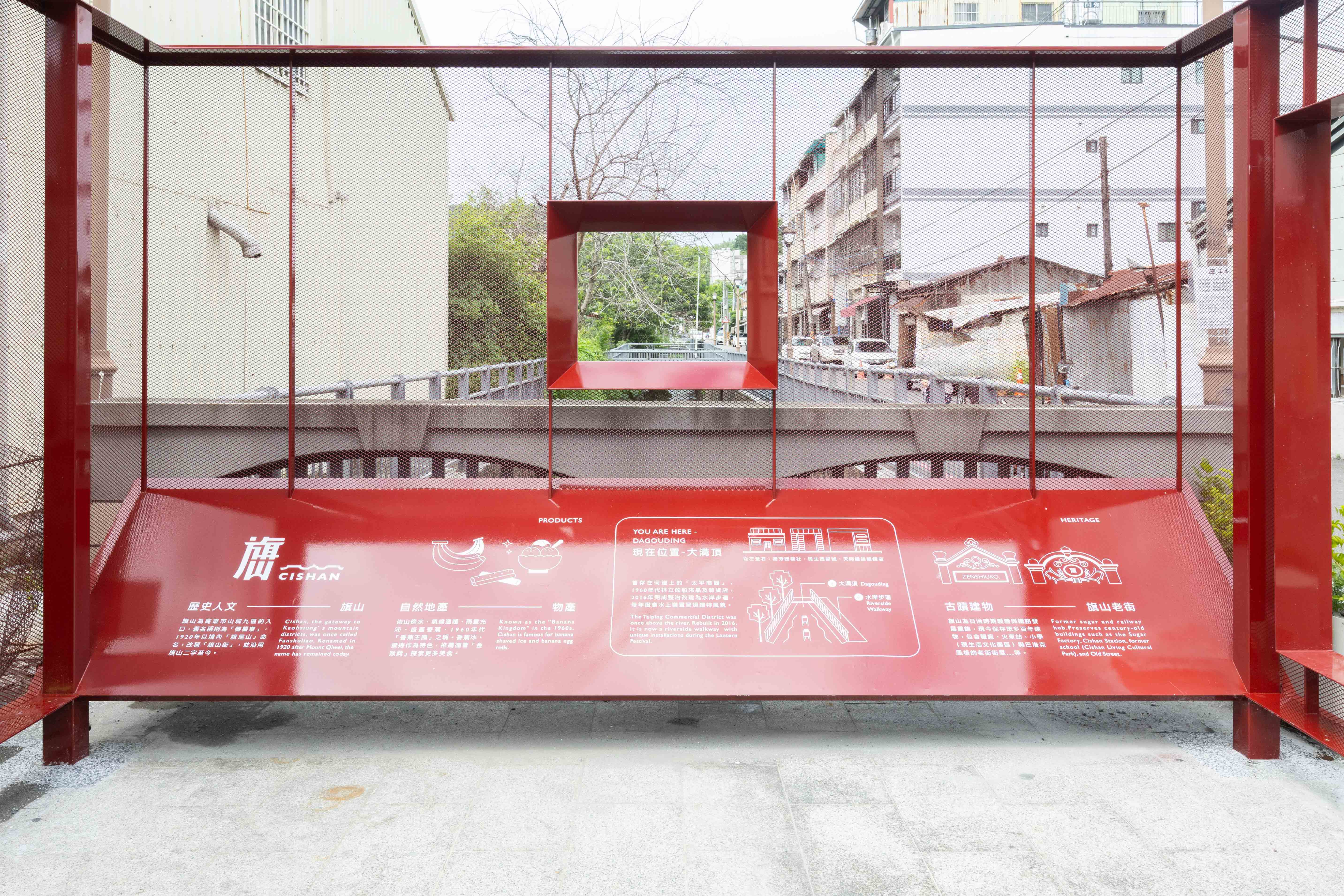 旗山商圈以「老街文化再現」為核心理念,從紅磚拱門等地方符號出發,發展區域品牌識別系統,並導入沉穩色調與圓弧線條設計,讓導引設施自然融入街景。為延長旅客停留時間,利用大溝頂空間打造「無人旅客中心」概念,設置導覽系統,以旗山老街為起點,串聯周邊景點,拓展遊憩動線與觀光體驗半徑,帶動商圈人流與地方經濟活力。