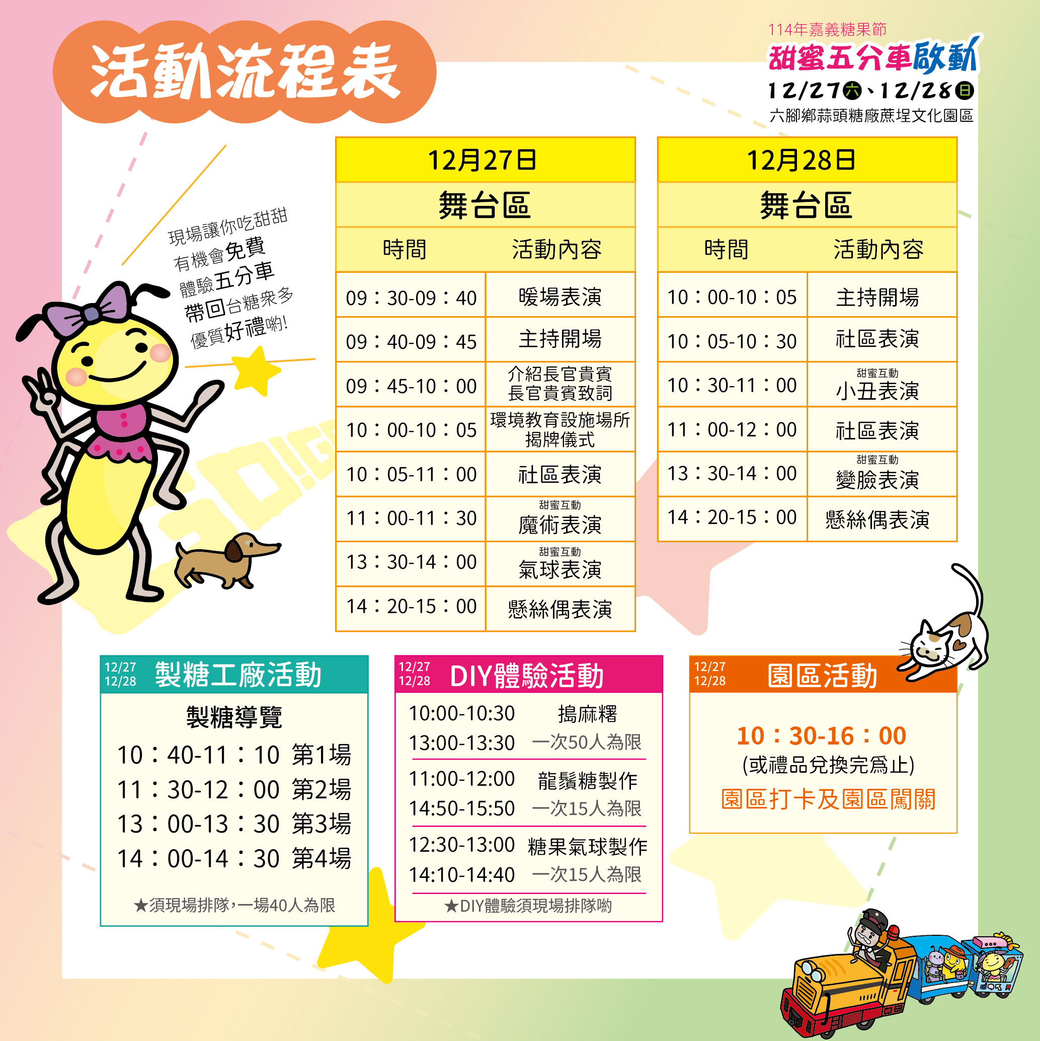 台糖指出,「114年嘉義糖果節—甜蜜五分車啟動」活動也於明日同步開跑。今年糖果節以「甜蜜體驗」為核心,規劃包含甜點市集、闖關活動、製糖工場導覽、DIY手作體驗、街頭藝人演出等精彩內容。活動亮點之一為「甜蜜五分車」體驗活動,特別開放六腳鄉在地學童免費搭乘,透過車長的導覽解說,瞭解早期糖業運輸的情景,一般民眾亦可參加闖關活動兌換五分車體驗券,一起體驗糖業文化之旅。