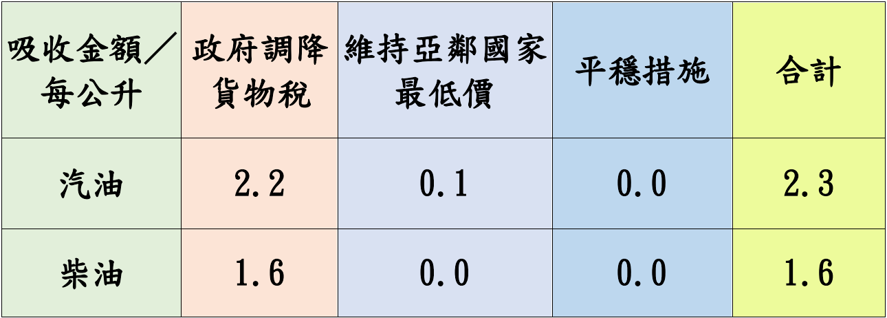 本週依油價公式及政府調降貨物稅(汽、柴油每公升各共2元及1.5元)調整國內油價,並持續以亞鄰國家最低價及平穩措施運作,協助穩定國內油價,114年台灣中油累計共吸收約64.44億元。調價後各式油品參考零售價格調幅及調整金額如附表,實際零售價格以各營業點公告為準。(亞鄰油價資訊請參考全球資訊網https://www.cpc.com.tw產品與服務--產品價格與資訊--亞鄰各國比較表)