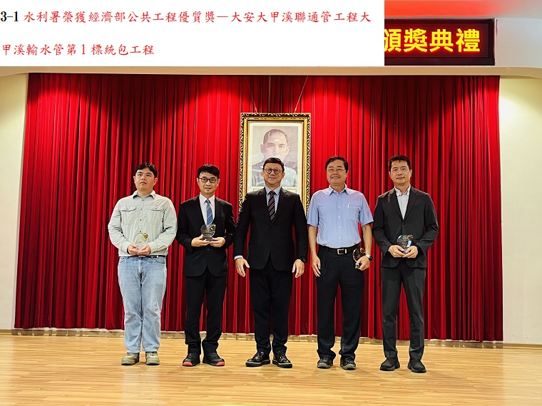 「公共工程優質獎」頒獎典禮由經濟部主任秘書莊銘池主持,水利署由副署長王藝峰率領獲獎團隊出席。水利署在114年優質獎共有大安大甲溪聯通管工程大甲溪輸水管第1標統包工程、荖濃溪里嶺伏流水統包工程-水管橋工程、房裡海堤整體環境改善工程(一)、北港溪虎尾堤段整體環境營造工程(一期)、二仁溪縱貫鐵路橋下游段整體環境營造工程(第五期)、113年度卑南溪卑南堤段構造物維修改善工程等6件獲得獎項;同時陳柏宗主任工程司榮獲個人貢獻獎殊榮。
