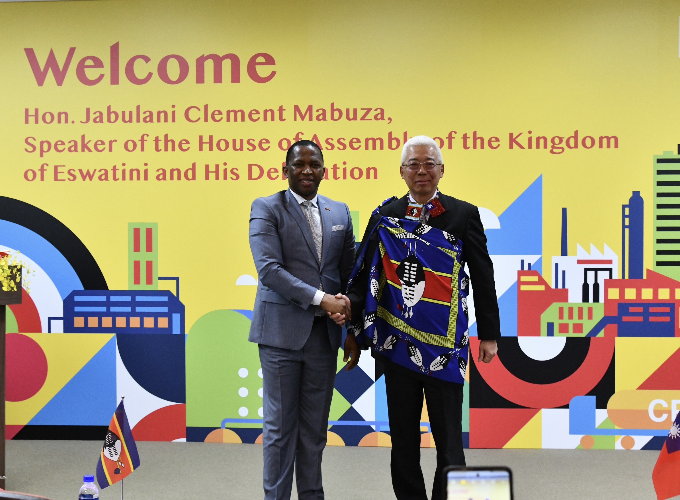 史國議長馬布札(左)贈送董事長方振仁(右)史國特色披巾,及以台史兩國國旗的串珠飾品,象徵友誼與祝福。