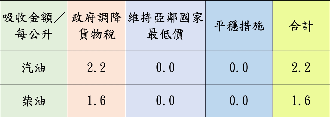 按浮動油價機制調整原則,汽、柴油價格每公升應各調降0.2元,已低於亞洲鄰近國家(日、韓、港、星)。吸收金額如附表。