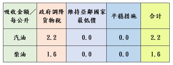 本週依油價公式及政府調降貨物稅(汽、柴油每公升各共2元及1.5元)調整國內油價,並持續以亞鄰國家最低價及平穩措施運作,協助穩定國內油價,114年台灣中油累計共吸收約64.44億元。調價後各式油品參考零售價格調幅及調整金額如附表,實際零售價格以各營業點公告為準。(亞鄰油價資訊請參考全球資訊網https://www.cpc.com.tw產品與服務--產品價格與資訊--亞鄰各國比較表)