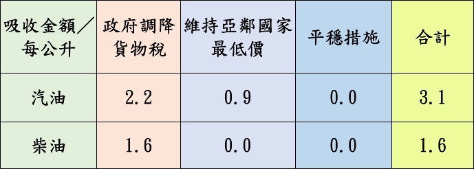 維持亞鄰最低價及調降貨物稅 汽、柴油各吸收2.6元及1.6元 明(2)日起汽、柴油各調漲0.3元及0.6元