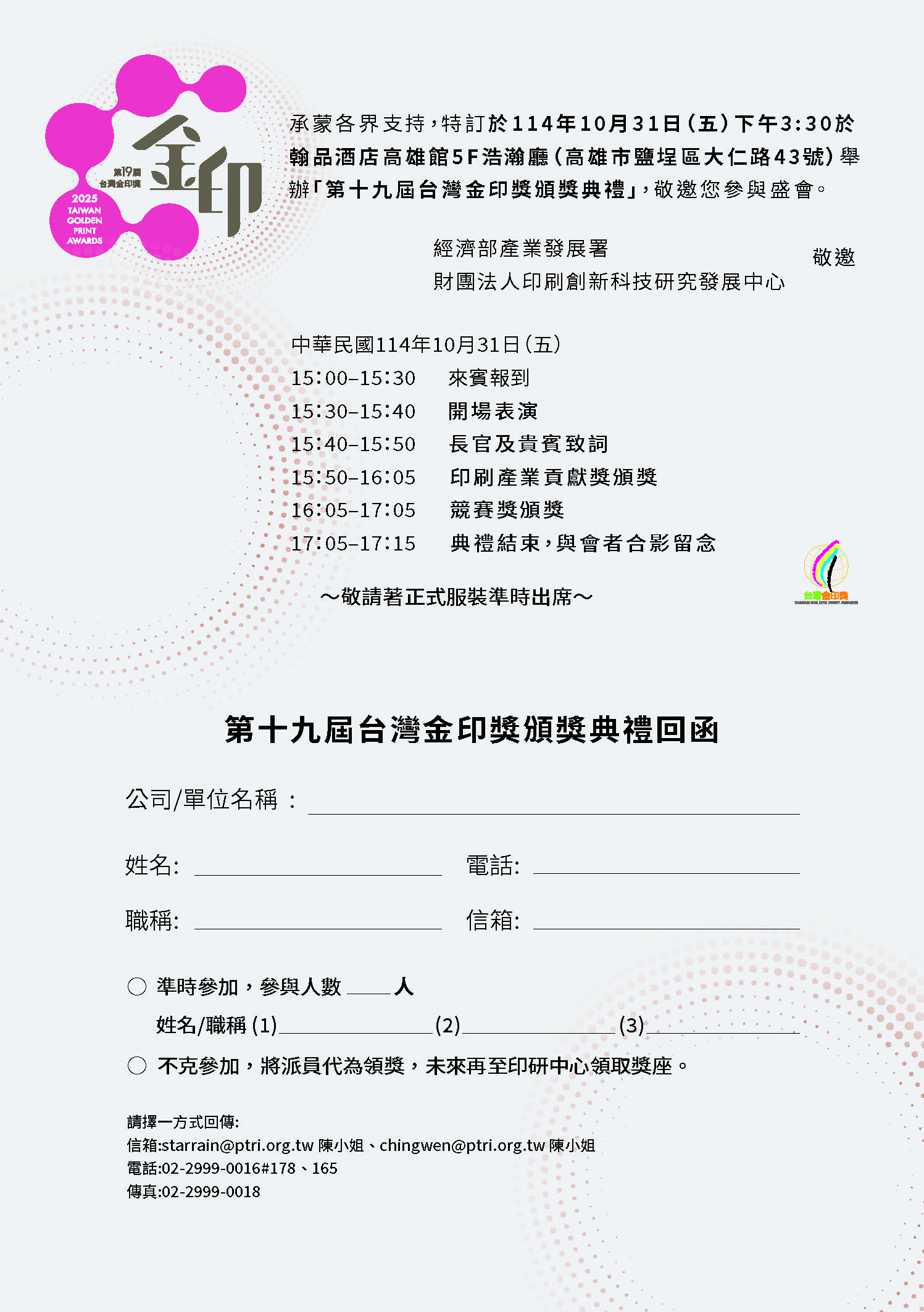 「臺灣金印獎」在產官學研的攜手推動下,表揚國內優良廠商無數,透過獎項頒發,不僅肯定並感謝業界先進對產業發展的貢獻,更是鼓勵印刷業者持續精進與技術創新,透過產學合作為印品注入創意火花,展現印刷產業的創新活力與發展潛力。金印獎競賽平台,匯聚技術、材料、智慧、環保、設計、人才等多方能量,展現產業在印刷技術與材料運用上的突破,並將設計美學融入印刷工藝,展現精湛的印藝價值,已成為推動印刷創新與展示產業進步的重要舞台,見證產業的成長與變遷,期待產學界的踴躍參與,讓印藝之美透過獎項的推廣擴散,發揚光大,邁向卓越。