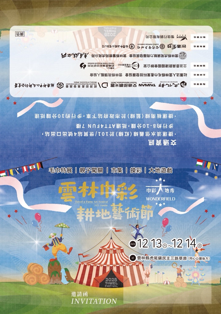 「雲林巾彩耕地藝術節」以雲林毛巾產業為核心,結合馬戲、親子活動、小農市集與商圈合作,呈現產業創新與地方文化力。今年以「巾彩大地秀 WONDERFIELD」為主題,透過創意展演、互動市集與馬戲體驗,打造連結土地、產業與生活美學的全民藝術盛會。
